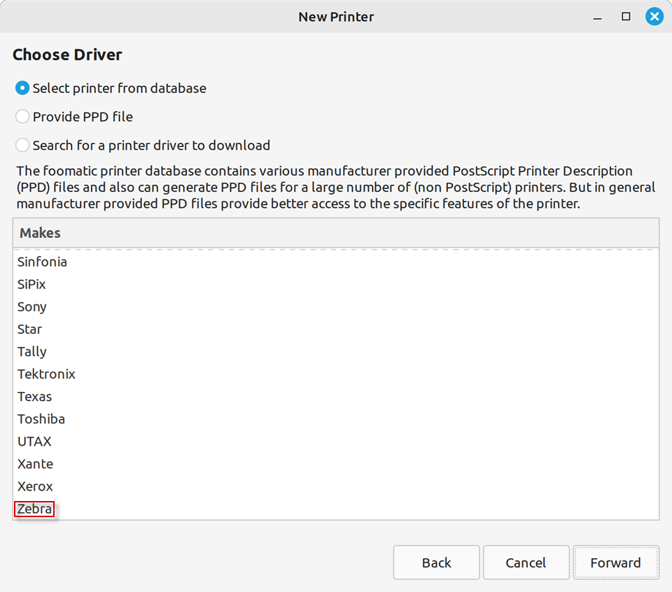 Select the Zebra printer from the database and press the Forward button.