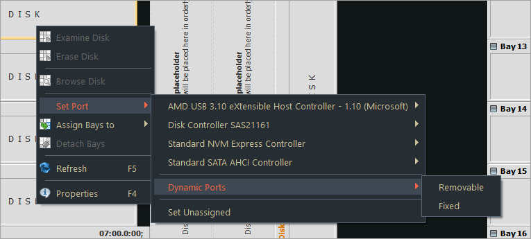 If you want to map a particular bay on the layout to be linked with a newly inserted disk which port is dynamically determined, from disk bay's context menu click then click type of disk you want to appear: Removable or Fixed.