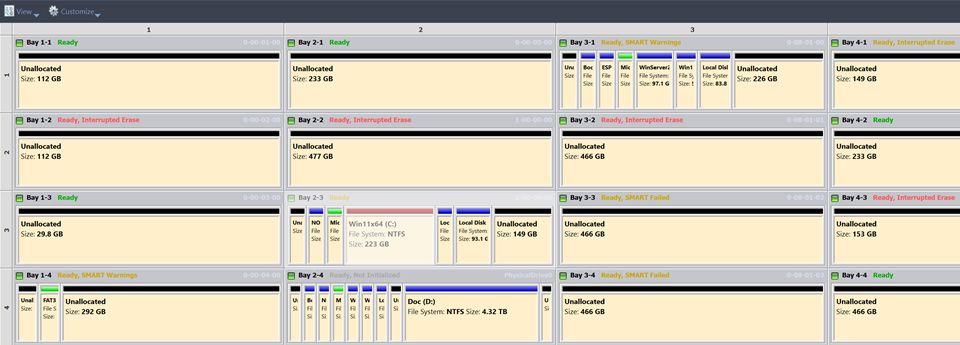 Now imagine inserting a HDD into the bottom-leftmost Bay of the disk array. Even finding the device in a list of 15 other disks would be tedious and not very intuitive. This is when creating a Disk Bay Layout is extremely useful. By creating a 4x4 Disk Bay Layout we can map the physical ports to their corresponding Bay in Active@ KillDisk and visually see our disk array like this: