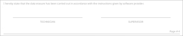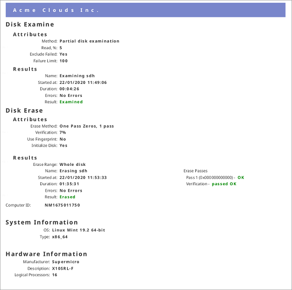 - Displays information pertaining to the erasure procedure conducted on the hard drive(s). Type of erasure algorithm, custom settings, date and time started and duration of the erasure are all listed here.