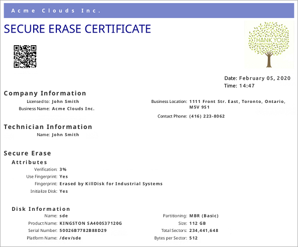 Active@ KillDisk provides printable certificates upon the completion of Disk Erase, Secure Erase or Disk Wipe. These certificates can be customized to include company-specific information and hardware/procedure description. Configuring custom settings is described in the Erase Certificate section of this guide.