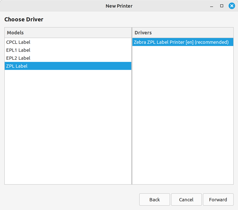 Select the Zebra printer from the database and press the Forward button.