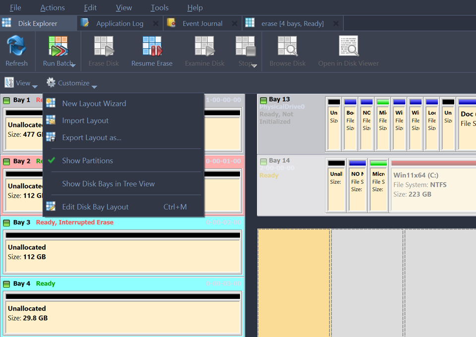 This view of Disk Explorer gives an access to local data storage’s through assigned Disk Bays organized in Disk Bay Layout and can be used to edit layout itself, manage Disk Batches and run main tasks, such as Disk Erase or Disk Wipe. This is the main perspective view for applications like KillDisk Industrial or KillDisk Industrial Systems.