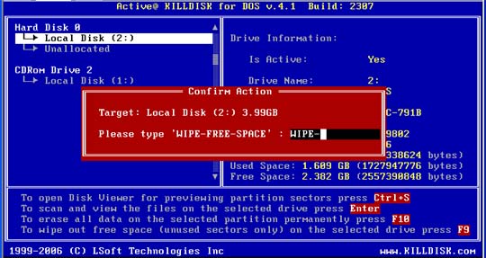 Type WIPE-FREE-SPACE and press [Enter]. Progress of the wiping procedure will be monitored in the Disk Wiping screen.